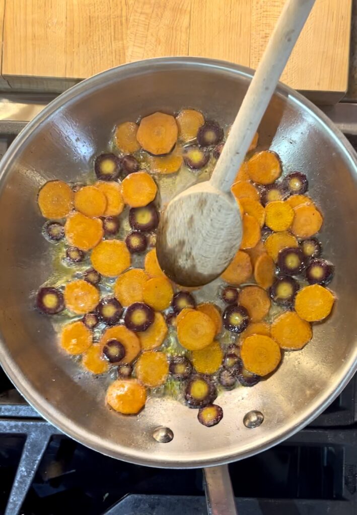 Start with fresh carrots. After cooking, the glazed carrots should still have some bite to them. If you start with past their prime, floppy carrots you won’t get that bite after they’re cooked and they’ll be mushy. We suggest using a variety of carrot colors to add some extra appeal to this simple side dish. For a rustic look, don’t peel your carrots. Just give them a good wash and dry the carrots with a clean cloth. Slice them into thin round slices about 1/4″ thick and about the size of a nickel.